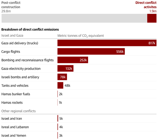 - Nachkriegsphase – Wiederaufbau und Müllentsorgung: Der Wiederaufbau zerstörter Infrastruktur sowie das Räumen von Trümmern erzeugt Emissionen in einer Größenordnung, die mit dem Jahresausstoß von mehr als 135 Staaten vergleichbar sind.
