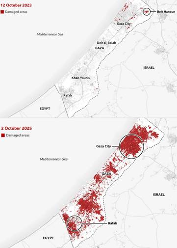 Vergleich zerstörter Gebiete im Gazastreifen zwischen Oktober 2023 und Oktober 2025. [BBC, 2025]