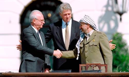 1993 vermittelte Bill Clinton ein historisches Treffen zwischen Israels Premierminister Jitzchak Rabin und dem PLO-Vorsitzenden Jassir Arafat – die Hoffnungen auf Frieden waren groß. [The Guardian, 2025]