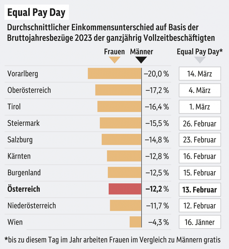 Der Equal Pay Day markiert jenen Zeitpunkt, bis zu dem Frauen im Vergleich zu Männern statistisch gesehen unbezahlt arbeiten. Anlass ist die weiterhin bestehende Einkommenslücke: Zuletzt lag der Gender Pay Gap in Österreich bei rund 12,2 Prozent, womit sich die Lohnschere zwar etwas verkleinert hat, Frauen aber weiterhin deutlich weniger verdienen. Regionale Unterschiede bleiben groß – mit geringeren Gehaltsunterschieden etwa in Wien [ORF, 2025].