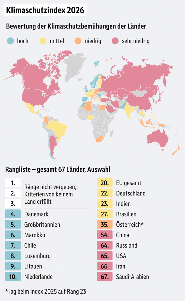 Im Klimaschutzindex CCPI 2026 rutscht Österreich im Vergleich zu 2024 von Platz 23 auf Rang 35 ab. Die Einstufung erfolgt damit nur noch im globalen Mittelfeld – als „Low Performer“ in der Kategorie „niedrig“ [ORF, 2025]