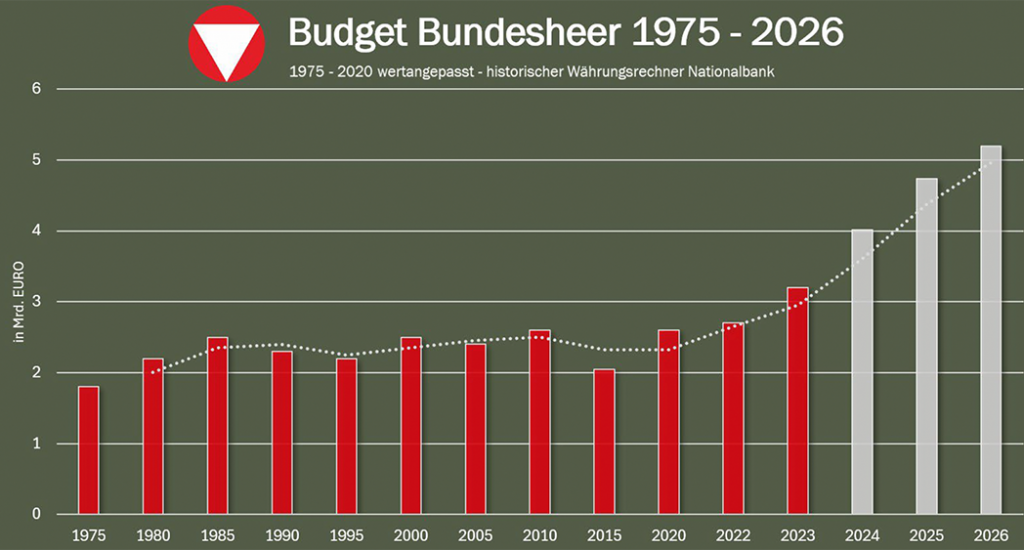 Budgetpfad des österreichischen Bundesheeres seit 1975 [Bundesheer, 2025]